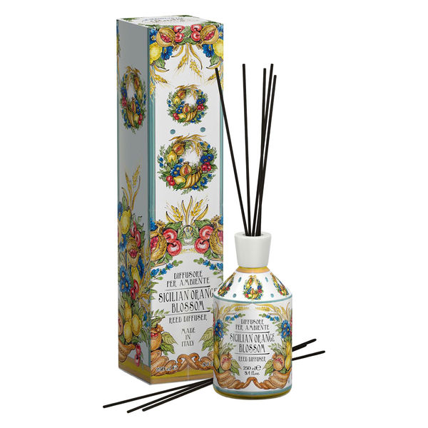 | 商品の特徴 | イタリアのルネサンス時代に発祥した白地に色鮮やかな色彩を施したマヨルカ焼き(錫釉陶器:すずゆうとうき)がデザインされたシリーズ。リードディフューザーの容器はプラスチックで割れる心配もなく、本体のみならずパッケージにもデザインが施されているのでプレゼントとしてもぴったりです。シチリアンオレンジブロッサム:15世紀、シチリア島ではオレンジなどの柑橘類の宝庫となり、多様なオレンジが収穫されるようになりました。島中にオレンジの花が咲き誇り、柑橘類が豊かに育つ様を描き、柄にしたものを施しました。 | ||