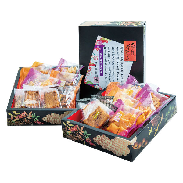 - 薄焼あられ・薄焼ざらめ・海老あられ・たがね焼・七味あられ・中粒あられ×各2袋、おかき(醤油・ざらめ)各3袋