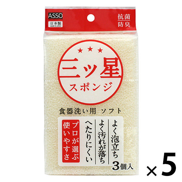 キッチンスポンジ 三ツ星スポンジ 食器洗い用 ソフト ホワイト ウレタン 抗菌 日本製 1セット(1パック(3個入)×5)ワイズ