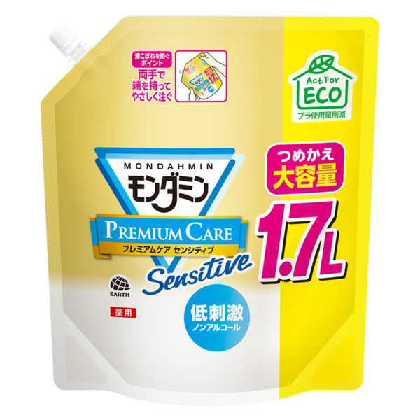| 商品の特徴 | ●モンダミン プレミアムケア センシティブの詰替え大容量1.7L。オールインワンでお口の健康を守る低刺激ノンアルコールタイプ。●いくつもの作用で、気になるお口のトラブルをまるごとケア。●しっかり洗浄●薬用成分(CPC・GK2・TXA)・歯のコーティング成分(セラック)・クーリング成分(香料中)を配合。●やさしいプレミアムミントの香味。ひんやり心地よい清涼感が続く。●Act For ECO:つめかえ使用により、プラスチック使用量を約78%減(本体1080mL容器1.6本分との重量比)【防災】 | ||