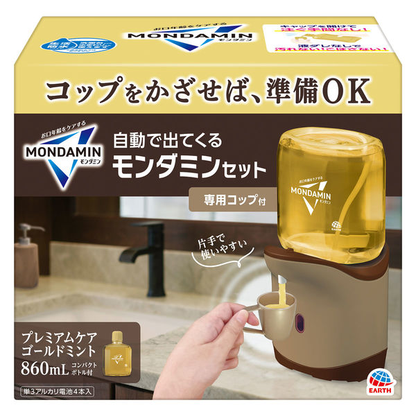 | 商品の特徴 | ●コップをかざせば、準備OK●自動で出てくるモンダミンセット 専用コップ付●キャップを開けて注ぐ手間なし!液ダレなしで汚れない!こぼさない!●コップをかざすだけでモンダミンが自動で出てくるので、手間なく簡単に使えます。●ボトルの液ダレやベタつきがないので衛生的に使えます。●単3アルカリ電池4本付きで、開封後すぐに使用できます。●生活防水(IPX4)洗面台などの水まわりでも使えます※完全防水ではありません●プレミアムケアゴールドミント860mLコンパクトボトル付!●アルコール配合【医薬部外品】【洗口液】 | ||
