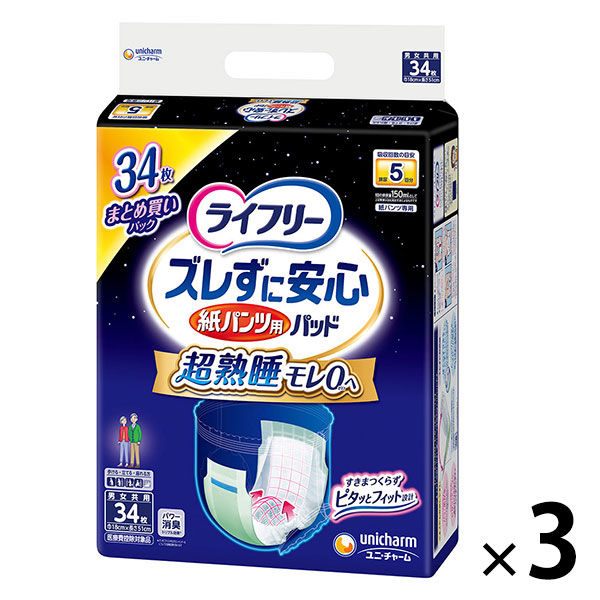【パンツ用パッド】大人用紙おむつ ライフリー 尿とりパッド ズレずに安心 夜用スーパー 5回吸収 1セット(34枚入×3パック)