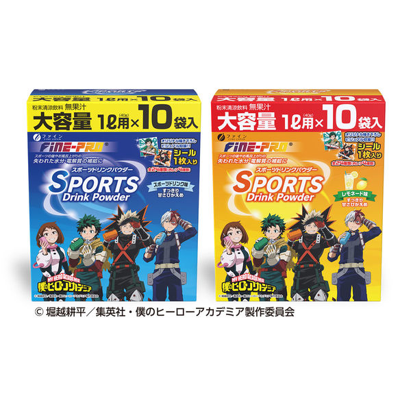 | 商品の特徴 | スポーツドリンクパウダーが、TVアニメ『僕のヒーローアカデミア』のスペシャルパッケージになって登場!■特徴ハイポトニック飲料だから、浸透圧が体液より低いため吸収がスムーズ!水分、塩分、エネルギーを速攻チャージ!■お味・後味すっきり爽やか!スポーツ時や後にもごくごく飲めるスポーツドリンク味・ほどよい甘みと酸味の爽やかな味わいのレモネード味■こんな時におすすめ・こまめな水分補給に!・運動中のパフォーマンスサポートに! | ||