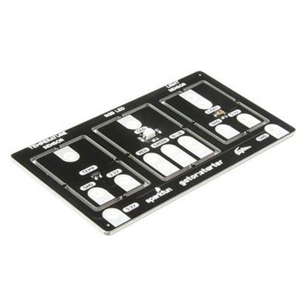 | 商品の特徴 | micro:bitや他のマイコンボードとワニ口クリップで接続できるgator:シリーズのスターターボードです。また、ブレッドボードすら使わずにプロトタイピングできるProtoSnapシリーズの一つでもあります。 1枚のボード上に温度センサ、光センサ、およびRGB LEDの各ボードが配置され、そのままでも、またそれぞれを小さなボードとして切り離しても使用できる、ユニークな形状の製品です。 1枚のボードとして使用する場合には、gator:ボードの端にクリップすることで三つの機能に電源が供給されます | ||