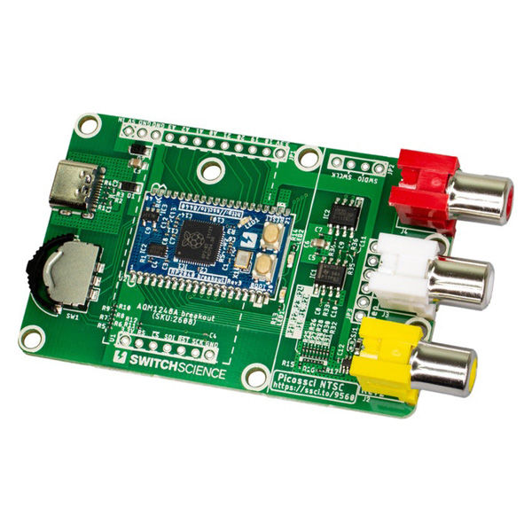 | 商品の特徴 | ビデオ出力端子/オーディオ出力端子を搭載した RP2040 マイコンボード(Picossci)です。なおマイコン部には を利用してます。 ビデオ端子はソフト処理によりビデオストリームデータをR2R-DACに流し込み、NTSC信号を出力してます。またステレオオーディオ端子にはI2S-DAC( )のオーディオ信号が出力されます。 CPU周辺機能として、 汎用LED × 3(黄緑x2/赤x1)、レバースイッチ(左右・押し込み)、SDカードソケットが搭載されていて、ソフトウェアから直接利用できます | ||