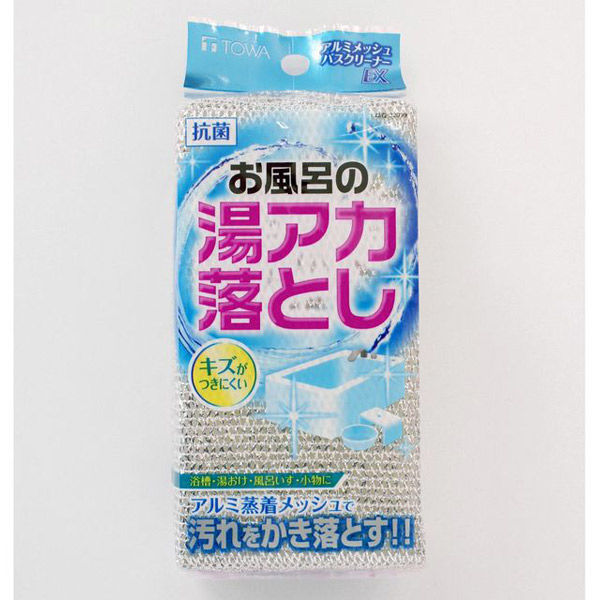 | 商品の特徴 | お風呂の湯アカ落としアルミ蒸着メッシュで汚れをかき落とす!!●アルミ蒸着ネットの凸凹が湯アカや水アカをラクラク落とします。●ソフトなポリエステルフィルムにアルミ粒子を蒸着した、浴槽や浴室をキズつけにくいネットです。●スポンジに抗菌加工を施しています。●吊るす場合に便利なヒモ付です。 | ||