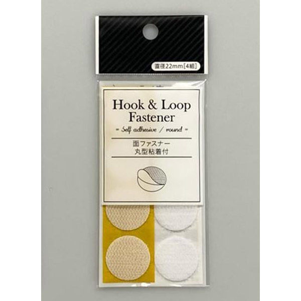 | 商品の特徴 | 取り付け簡単な粘着付の面ファスナーです。丸型タイプです。直径22mm。 | ||