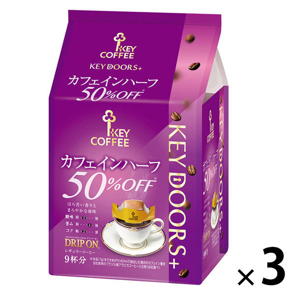 【ドリップコーヒー】キーコーヒー KEY DOORS+ ドリップ オン カフェインハーフ 1セット(9杯分×3袋)