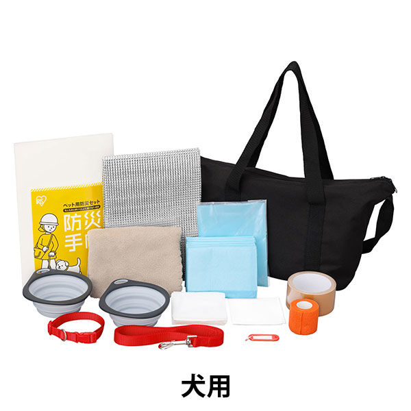 | 対象動物 | 犬 | セット内容 | ショルダーバッグ、ティッシュ×2、折りたたみトイレ、防臭袋×20枚、ペットシーツ×10枚、迷子札、首輪、アルミシート、タオル、おそうじシート×10枚、自着性テープ、ハンカチ、リード、テープ、防災手帳 |