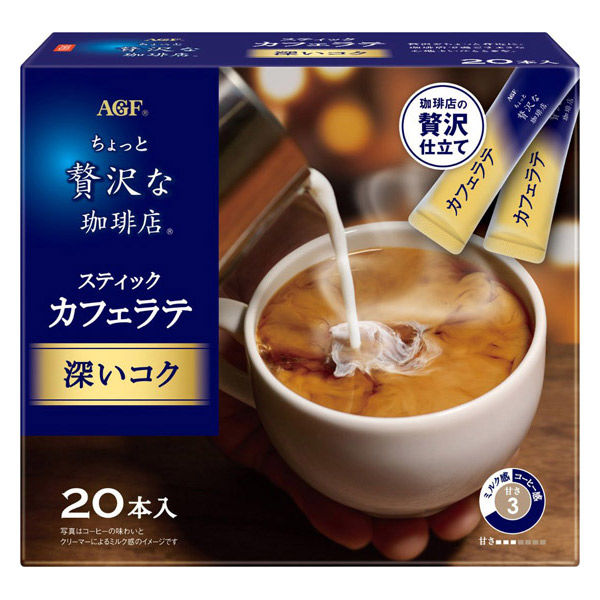 | 商品の特徴 | AGF(エージーエフ)「ちょっと贅沢な珈琲店」 スティックカフェラテ 深いコク 20本は、アラビカ豆を贅沢に使用、飲み始めに広がる焙煎の香りと、深煎りコーヒー豆由来の奥深いコクの余韻が心地よいカフェラテです。1杯1杯がいつも便利な個包装スティックタイプ。外食で味わうような完成されたコーヒーを求める方にふさわしい本格的なカフェラテです。甘さレベル3(AGF ブレンディ スティック カフェオレ比較)。 | ||