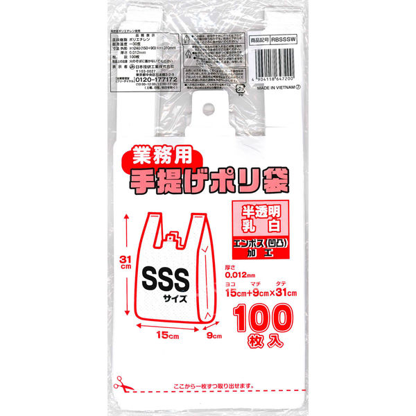 | 商品の特徴 | 大容量100枚入り乳白色SSSサイズのレジバッグでございます。 | ||
