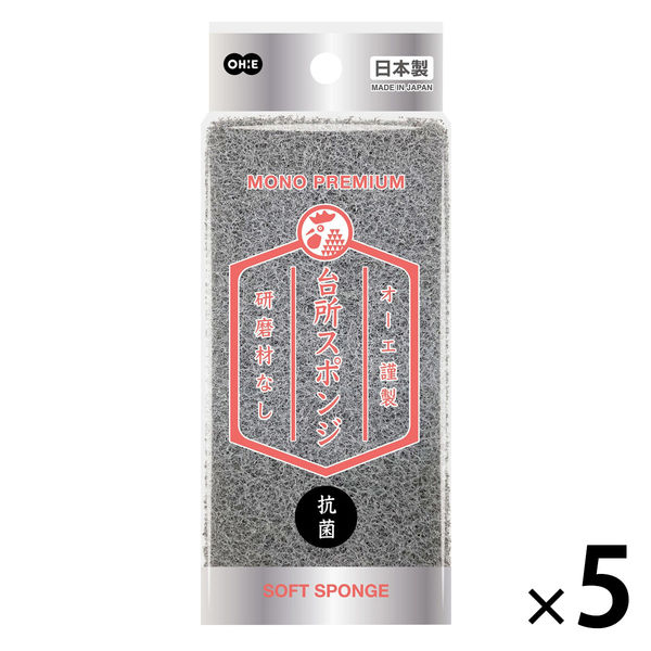 キッチンスポンジ モノプレミアム 台所スポンジ ソフト 抗菌 もこもこ泡立つ 研磨剤なし グレー 日本製 5個 オーエ
