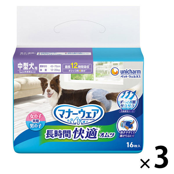 マナーウェア 長時間快適オムツ 男女共用 Lより大きめサイズ 中型犬用 16枚 3袋 ペット用 ユニ・チャーム