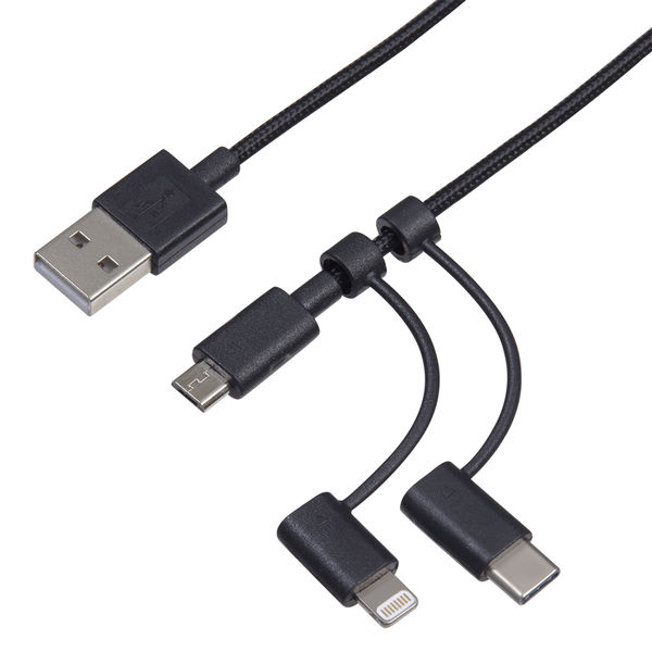 スマホ・タブレットや周辺機器の充電に。マイクロUSB・USB(Type-C)・ライトニングコネクタに対応した、これ1本でマルチに使える充電・データ転送用高耐久ケーブル。