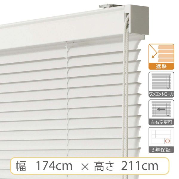 | 遮熱 | 太陽光の中で暑さを感じさせる日射の約50%は赤外線です。その赤外線を羽根(スラット)表面にコーティングした遮熱塗料で反射し、熱エネルギーの発生と室内への侵入を低減します。遮熱効果により省エネでとても経済的です。 | 寸法 | 幅174cm高さ211cm |