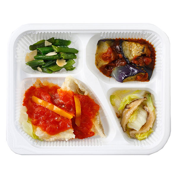 | 商品の特徴 | きくばりごぜんシリーズは1食あたり カロリー300kcal以下、塩分2.0g以下、野菜使用量100g以上の冷凍総菜セットです。野菜使用量…芋類きのこ類海藻類豆類を含む。生鮮換算。打ち粉して揚げた鱈や添えのキャベツに甘口のチリソースがよく絡みます。中華の揚げ物メニューですが1食250cal塩分1.6gと「きくばりごぜん」ならではのカロリーと塩分でお届けします。<主菜>白身魚のチリソース<副菜>麻婆茄子白菜としいたけのあんかけいんげんのアーモンド和え。 | ||