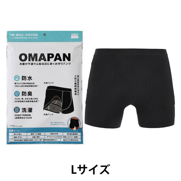 商品の特徴 ■防水/紙オムツ1回分(150cc)の水分を吸収。■防臭/5大排泄臭(うんち臭)をブロックできる特殊生地を開発。■洗濯可/洗濯50回可。心配な日あたり1回80円で経済的。■2枚5層構造/[分散+吸水+生地&防水+防臭]の2枚5層構造で、急な漏れでも他人にバレません。/■見た目はただのボクサーパンツ/3mm程度の厚み構造ながら、穿けば見た目はただのボクサーパンツ。■お守り+パンツ=OMAPAN/もし、人前で漏らしたら。そんな、人生のお守り【防臭×防水】パンツ。万一に備える漏便対策アイテム。