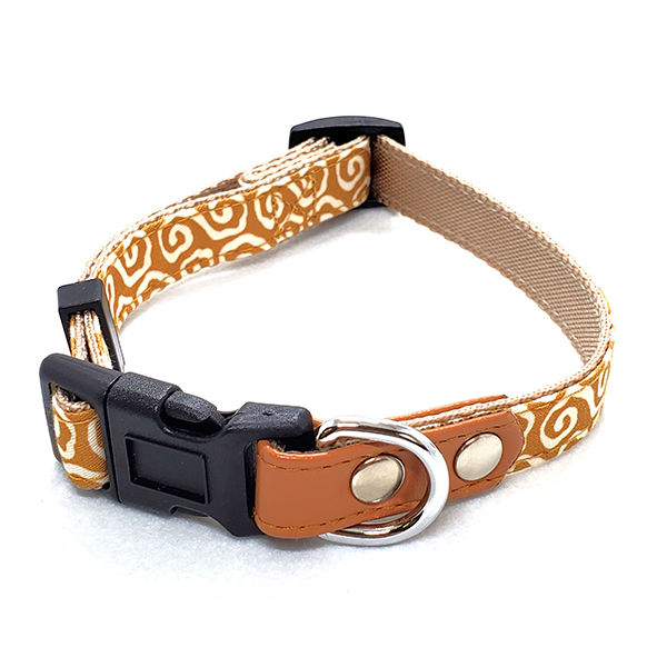 わんちゃん猫ちゃんとの生活が、もっとに楽しくなる様に、思いを込めたアイテムです。お洒落でかわいく脱着が簡単な、唐草柄の、わんちゃん用ワンタッチ式首輪です。