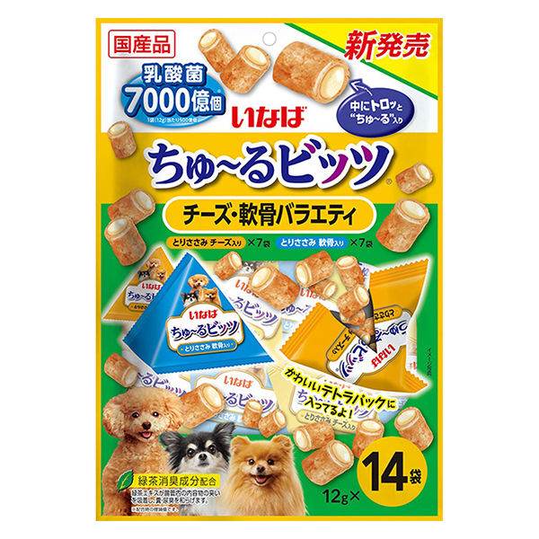 | 商品の特徴 | わんちゃんとのコミュニケーションにも便利なビッツタイプ。外はふっくら、中にトロッとちゅ~るが入っているため、2つの食感が楽しめます。出しやすく、見た目もかわいいテトラパック。保存料不使用。 | ||