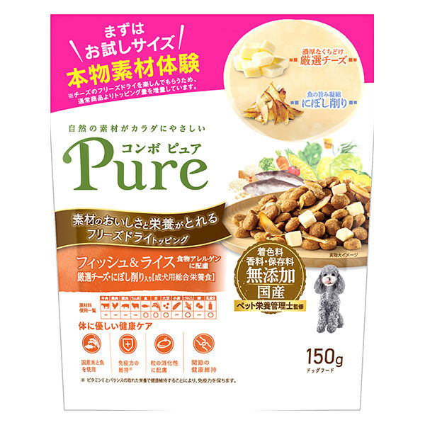 | 消費期限日数 | 540日 | 商品コピー | 見えるおいしさも。見えない栄養も。○素材、本物にこだわり抜いた、混じりっけないピュアなおいしさ。 ○不要な添加物は取り除き、本物を追求したブランド。 〇着色料・香料・保存料無添加。 ○食物アレルゲンに配慮し、国産米と魚を主原料に使用。 ○口に入れたときの食べやすさと、フードの風味をより感じることのできる粒サイズ。 〇麹菌由来の酵素パワーで粒の消化性にも配慮。 ○クリーミーな味わいと深みあるコクをより感じられるフリーズドライ厳選チーズと、食べやすさに配慮したにぼし削りをトッピング。 ○オレイン酸を多く含み、クセがなく素材の旨みを引き出すオリーブの恵みピュアオイル。 ○環境にもピュア。植物由来のインキを使うことでCO2の排出削減に貢献。 ○まずはお試しサイズ。 ○成犬用総合栄養食。 |