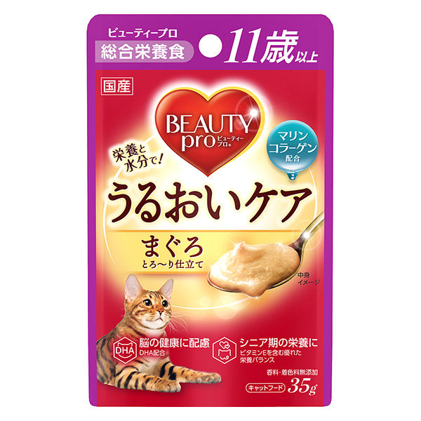 | 商品コピー | おいしく食べるだけ。ずっと健康。ずっと美しい。○「健康なカラダは美しい」獣医師監修のビューティープロ。おいしく食べて健康を保ちながら、体調の良さと毛並みの美しさを実感。 ○カラダに水分と栄養を届けるうるおいケア。 ○体内での吸収性に着目した低分子のマリンコラーゲン配合。 ○11歳以上のシニア期の猫ちゃんに適した栄養設計。 ○シニア期のために、不飽和脂肪酸であるDHA配合。 ○シニア期のために、抗酸化成分であるビタミンEを配合。 ○室内で暮らす猫ちゃんの健康のためにGABA配合。 ○とろ~り仕立て。 ○成猫用総合栄養食。 ○1袋35g。猫が大好きなとろ~りまぐろレシピ。 | パッケージのタイプ(ペット用) | パウチ |
