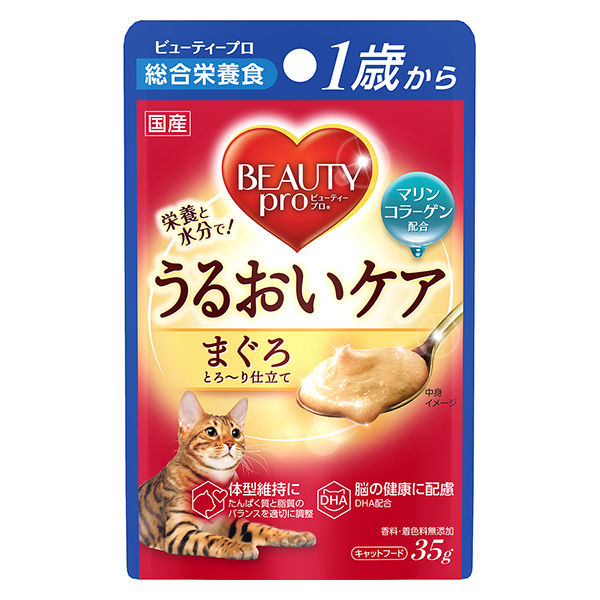 | 商品コピー | おいしく食べるだけ。ずっと健康。ずっと美しい。○「健康なカラダは美しい」獣医師監修のビューティープロ。おいしく食べて健康を保ちながら、体調の良さと毛並みの美しさを実感。 ○カラダに水分と栄養を届けるうるおいケア。 ○体内での吸収性に着目した低分子のマリンコラーゲン配合。 ○1歳以上の室内猫に適した栄養設計。 ○脳の健康に配慮してDHA配合。 ○室内で暮らす愛猫のためにGABA配合。 ○とろ~り仕立て。 ○成猫用総合栄養食。 ○1袋35g。猫が大好きなとろ~りまぐろレシピ。 | パッケージのタイプ(ペット用) | 袋 |