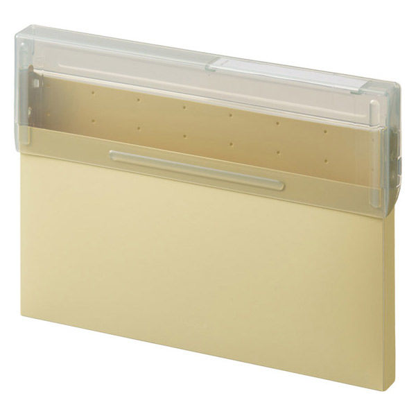 | 商品の特徴 | A5クリヤーホルダーが入るサイズ設計のケースファイルです。ポストカードやステッカーなど細々したものの収納にも最適です。フタが大きく開いて、スムーズに書類の出し入れができます。本体色に馴染む透明グレーのフタには見出しが付いており、分類がしやすいです。 | ||