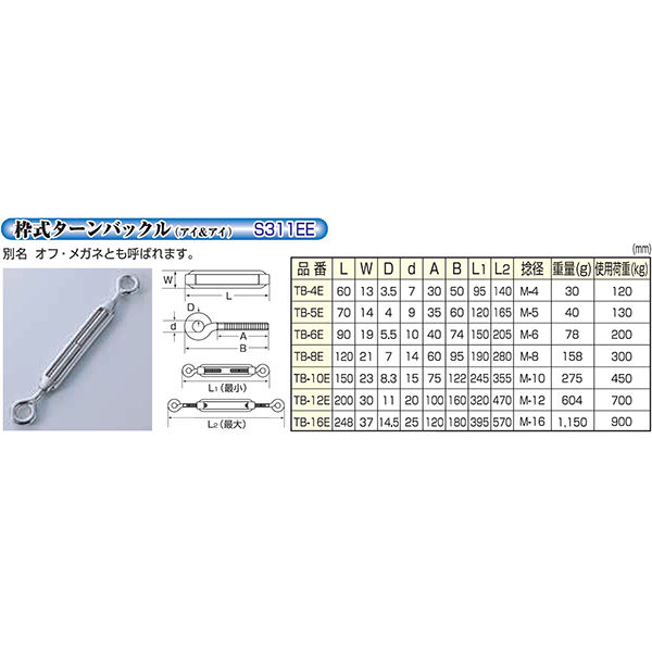 ひめじや 枠式ターンバックル(アイ&アイ)TBー6E オフ・メガネ 90mm×19mm 1100100014053 1個(直送品)