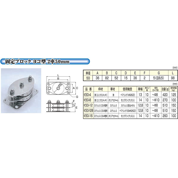 ひめじや 固定ブロックヨコ型2車50mm K50ー16 ステンレス ロープ径:~Φ10 1100100014190 1個(直送品)