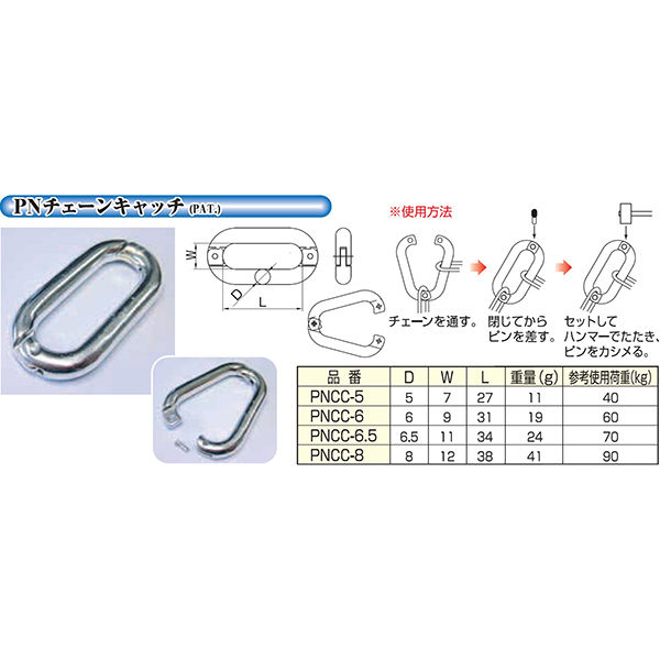 | 商品の特徴 | 錆びにくく丈夫なSUS304製のPNチェーンキャッチです。チェーンやワイヤーを確実に固定でき、摩耗やズレを防止。屋内外の軽作業や吊り下げ作業など幅広く活躍し、耐久性と安全性に優れたチェーン固定用の定番アイテムです。 | ||