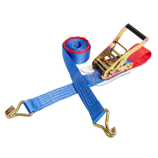 ラチェットバックル式カギフックのラッシングベルト、握り易いバックルと柔軟強度な繊維ベルトで荷に優しく簡単安全に荷締め作業ができます。