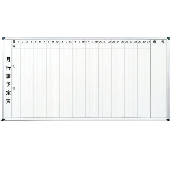 | 商品の特徴 | ●月ごとのスケジュール記入枠が印刷済みで、すぐ使えます。●スチール製の板面で、マグネットによる資料掲示が可能です。●軽量なアルミフレームで持ち運びや壁掛けがしやすいです。●吊り金具付きで設置もラクラクです。●マグネット使用可●吊り下げ金具付き●粉受付き | ||