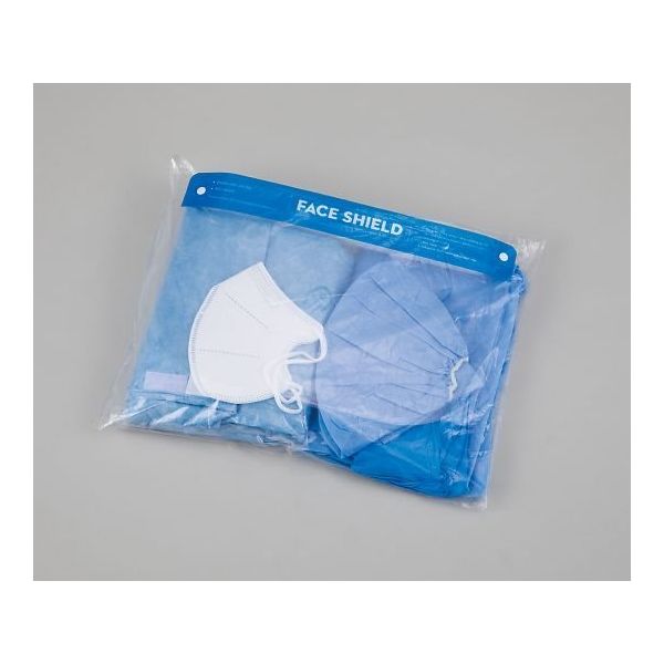 - ガウン×1枚、キャップ×1枚、ブーツカバー×1足、手袋×4枚、フェイスシールド×1個、KN95マスク×1個