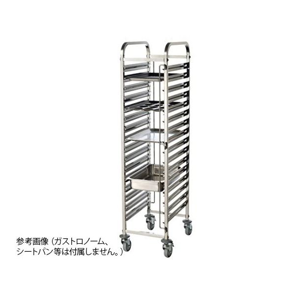 | 商品の特徴 | ●ガストロノームパンを省スペースで移動、ストックできます。●両側にガストロノームパンの脱落を防ぐストッパーが付いています。●写真のガストロノーム、シートパン等は別売りです。 | ||