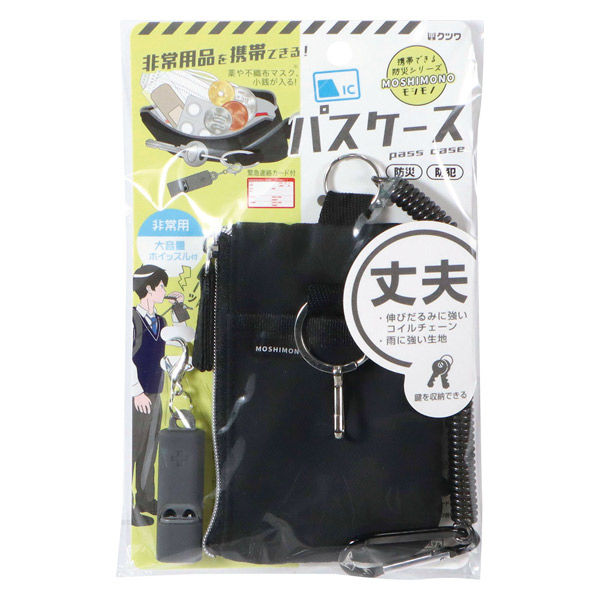 | 商品の特徴 | 【仕様1】非常用品を携帯できるファスナーポケット付【仕様2】雨に強い丈夫な生地、非常用ホイッスル付【仕様3】伸びだるみしにくいコイルチェーン付【仕様4】印刷が写りにくい透明カードポケット付【仕様5】キーリング、緊急連絡カード付 | ||