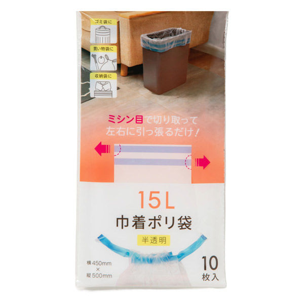| 商品の特徴 | 巾着タイプで袋が簡単に結べる、ひもがついたポリ袋です。 ミシン目で切り取って左右に引っ張るだけで巾着型になります。 結び目のロスが少ないため、容量いっぱいに使用できます。 厚みがあるので繰り返し使えます。 室内ペールのゴミ袋として、また収納袋、買い物袋としてもお使いいただけます。 ゴミ袋・買い物袋・収納袋の3WAY活用できる15Lサイズです。 | ||