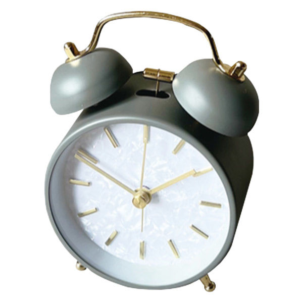 | 商品の特徴 | くすみカラーがかわいい置き時計です。 アラーム機能付きです。 クラシカルなツインベルデザインが、お部屋に上品さを演出します。 ラグジュアリー感漂うシェル風デザインの文字盤とゴールドカラーの秒針です。 スイープ仕様となっており、秒針がすべるようにして文字盤上をスムーズに動きます。 カチカチ音がしないので、寝室など静かな場所でのご使用にもおすすめです。 背面のボタンを押すとライトが点灯し、夜間でも時刻の確認ができます。 | ||
