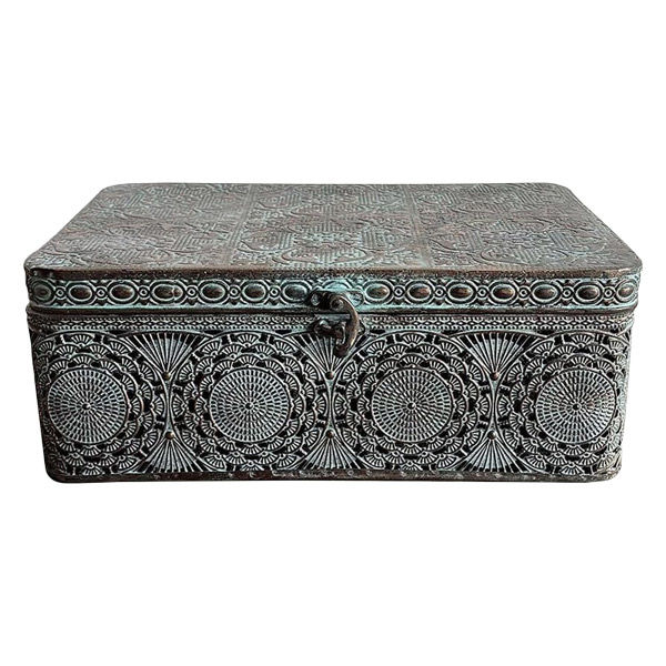 繊細なレース模様が施されたブリキ製の収納ボックス