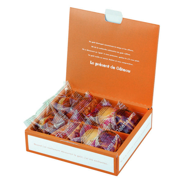 | 商品の特徴 | 明るいオレンジのパッケージが目を引く焼き菓子向けのギフト箱です。 | ||