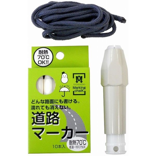どんな路面にも書ける。専用ホルダー付で汚れにくい。耐熱70℃で夏場の溶解対策に。専用ホルダー有。手が汚れず、落下防止用ヒモ付で高所作業に最適です。