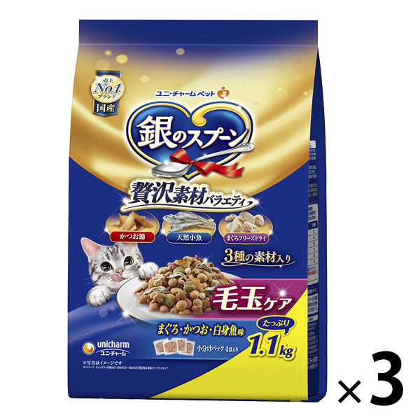 銀のスプーン 贅沢素材バラエティ 毛玉ケアまぐろ・かつお・白身魚に天然小魚・かつお節添え 国産 1.1kg 3袋 キャットフード ドライ