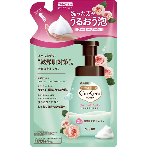 | 商品の特徴 | うるおいを守って洗い上げる泡タイプのボディソープ。たっぷりの泡を手でやさしく広げて洗います。セラミド(うるおい成分)を与え、肌に残して洗う「セラミド保持処方」採用。しっとりなめらかな洗い上り。つめかえ用。弱酸性、低刺激性。パラベンフリー。敏感肌の方の協力によるパッチテスト済み。(すべての方に刺激が起こらないというわけではありません。)はなやかな、フルーティーローズの香り。 | ||