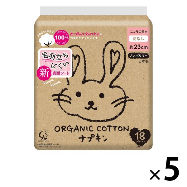 【生理用品】 ナプキン 昼用 羽なし 23cm オーガニックコットンナプキン ノンポリマー 1セット(18枚×5個) コットン・ラボ