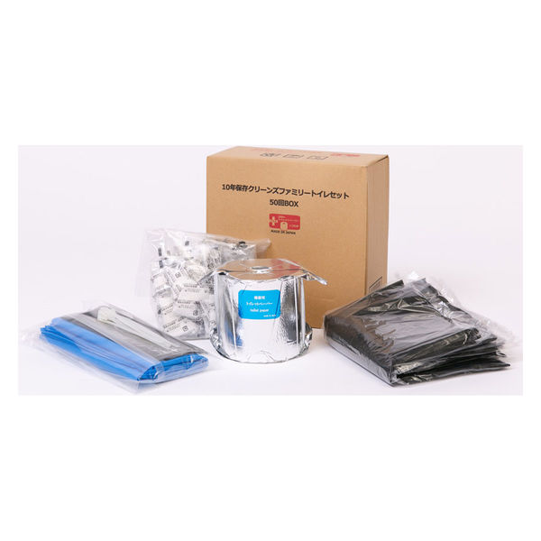 | セット内容 | アルミ蒸着真空包装200m巻トイレットペーパー1ロールパック×1個、凝固剤×50個、汚物処理袋×50枚、汚物保管袋×5枚、結束バンド×5本、便座カバー×1枚 | ||