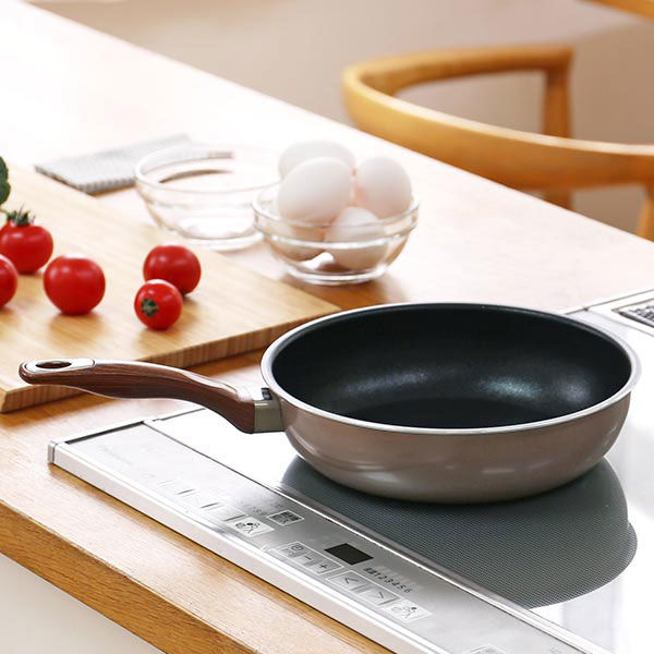 IHクッキングヒーター、ガス火対応のロハコ限定軽量フライパン。こびりつきにくく、料理がおいしく調理できます。おしゃれで可愛いピンクゴールドカラー。金属ヘラも使えます。