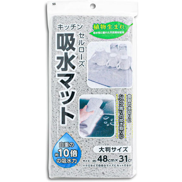 | 商品の特徴 | ・吸水力にすぐれたセルローズを使用した、大判サイズのキッチン吸水マット。自重の約10倍の吸水力! 食器の水切りや、シンク周りの拭き取りに。約48×31cmの大判サイズ。 ハサミなどで自由なサイズにカットして使えます。・植物生まれの天然素材セルローズ使用。 環境に優しい製品です。安心の日本製。本品は乾燥すると硬くなりますので、使用前には必ず水を含ませて柔らかくした後、水を絞ってお使いください。強く引っ張ったり、ねじるようなしぼり方はしないで下さい。 | ||