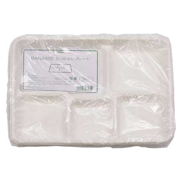 電子レンジ対応 バガス素材の仕切り付プレート。5つ仕切りがあり、ビュッフェスタイルの使い捨て容器としてもおすすめです。