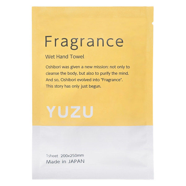 アロマオイルを配合した国産の香り付きおしぼり。温かみのある柚子の香り。大判厚手で拭き心地の良い紙おしぼりです。