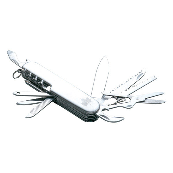 | 機能 | ナイフ、ハサミ、釣り針外し、缶切り、縫い針、やすり、ノコギリ(細)、ノコギリ(粗)、栓抜き、ネイルクリーナー、あま皮とり、コルク抜き、プラスドライバー、マイナスドライバー | 材質 | 主素材:ステンレススチール、スチール |