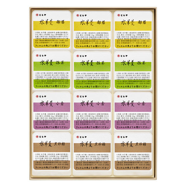 | 商品の特徴 | ひんやりと艶やかな水羊羹。涼を届ける、とらやの夏の贈りもの。しっかりとした食感とコクのある味わいが特徴の水羊羹。すっきりとした甘みのこし餡の『御膳』、小豆の食感を大切にした『小倉』、黒砂糖独特の風味を生かした『黒砂糖』、香り豊かな抹茶でおつくりした『抹茶』の4種類の味をご用意いたしました。 | ||